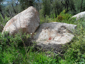 Ja de tornada, uns 150 metres abans d'arribar a la Pedra Comanera I, veiem a tocar el camí a la nostra dreta la pedra amb cassoletes del Mas Armet.
